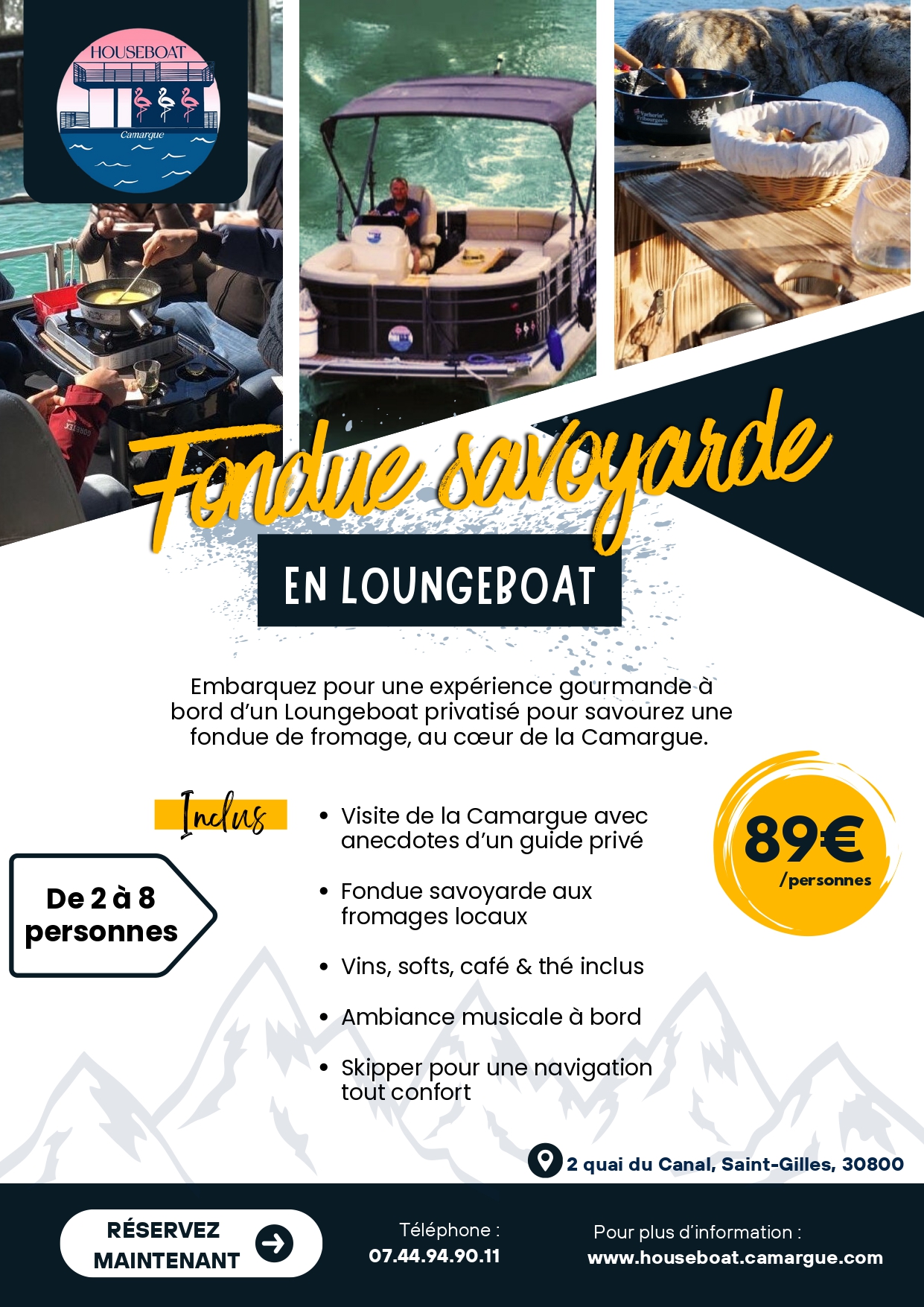 Embarquez à bord de notre LoungeBoat pour une immersion authentique. Découvrez traditions locales, manades, vignobles et artisanat. À bord, savourez un petit-déjeuner, un apéritif ou un repas Terre ou Mer, pour être au cœur des saveurs camarguaises !